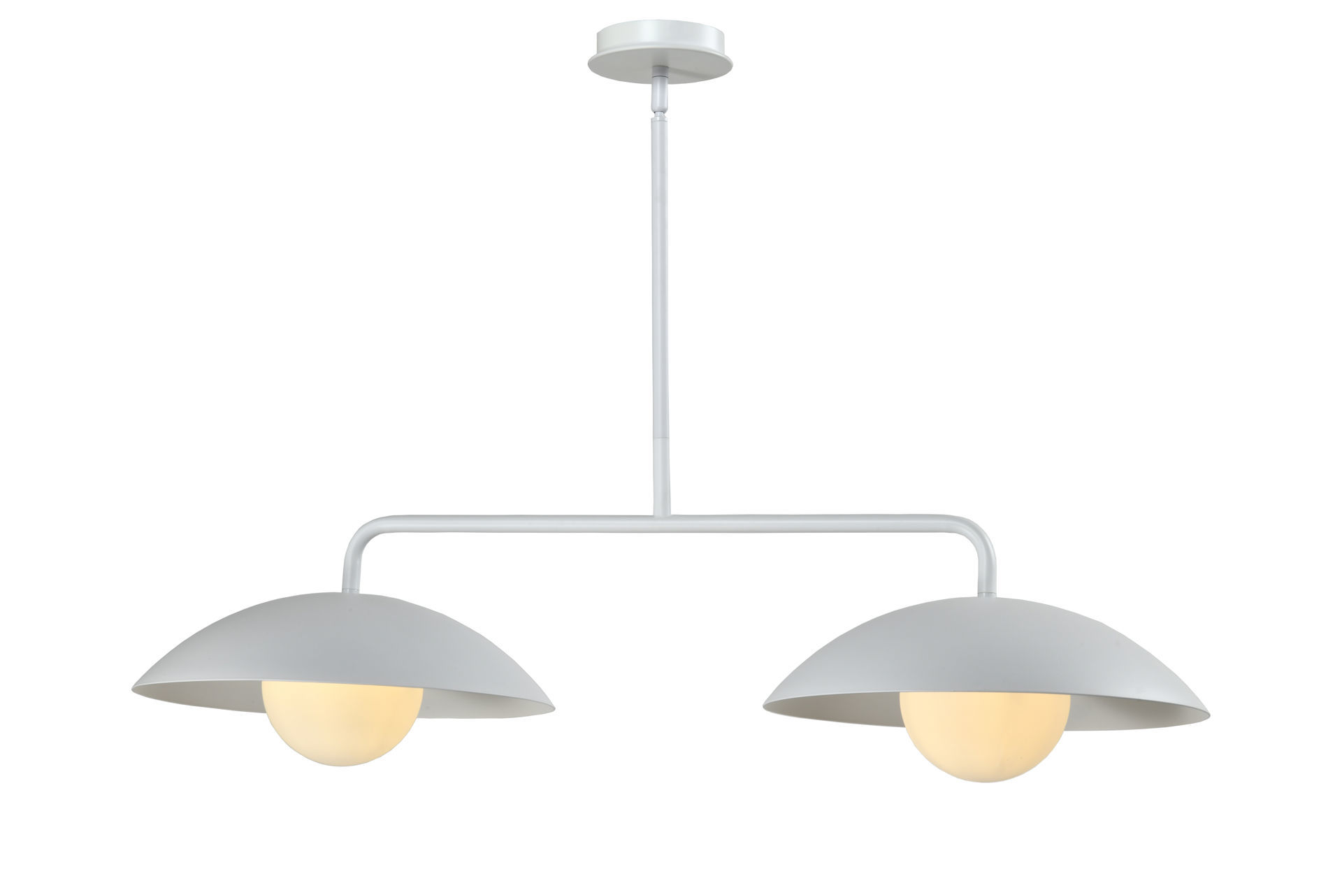Alliant originalité et élégance, ce luminaire se distingue par sa silhouette audacieuse composée de deux abat-jours légèrement incurvés qui mettent en valeur les globes givrés, lesquels diffusent une lumière douce et enveloppante. Sa forme sculpturale en fait une pièce décorative idéale pour une salle à manger, un ilôt, ou même un bureau, apportant une touche contemporaine et raffinée à tout espace.