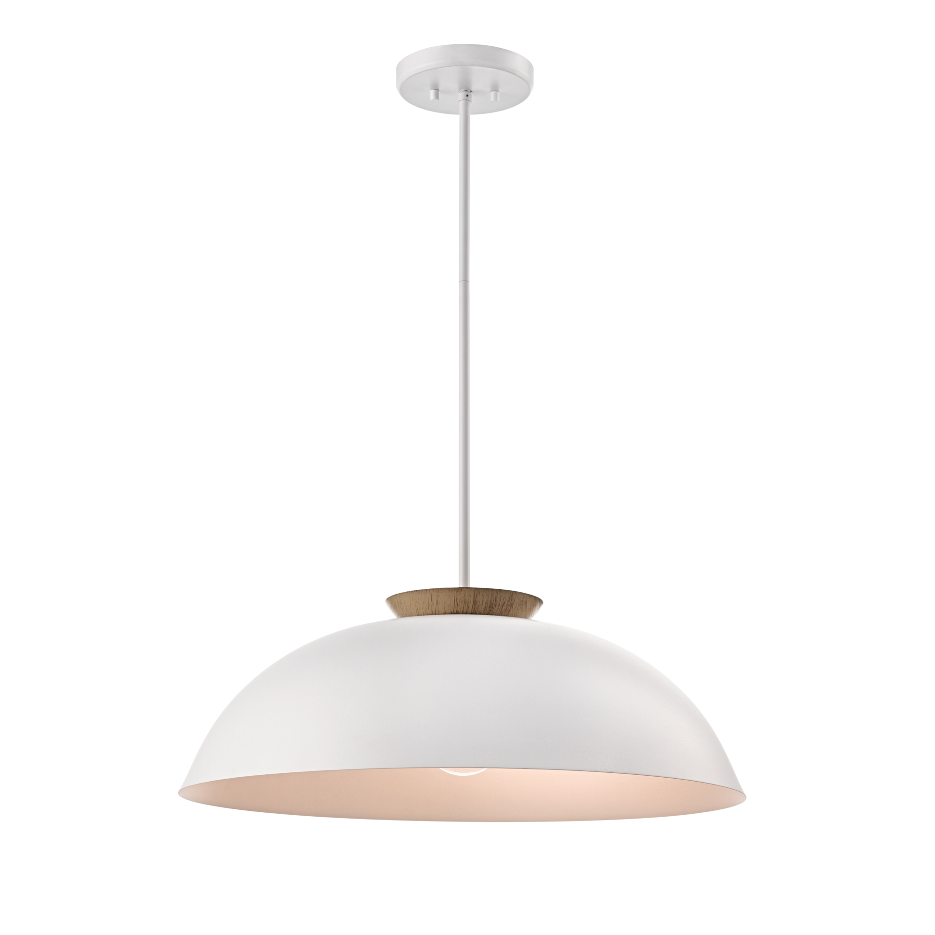 Ce luminaire suspendu séduit par son design moderne et épuré, mariant harmonieusement le métal à une finition imitation bois pour un rendu à la fois contemporain et chaleureux. Sa silhouette arrondie diffuse la lumière vers le bas, créant une ambiance accueillante et bien définie, parfaite au-dessus d’une table, d’un îlot ou dans une entrée.