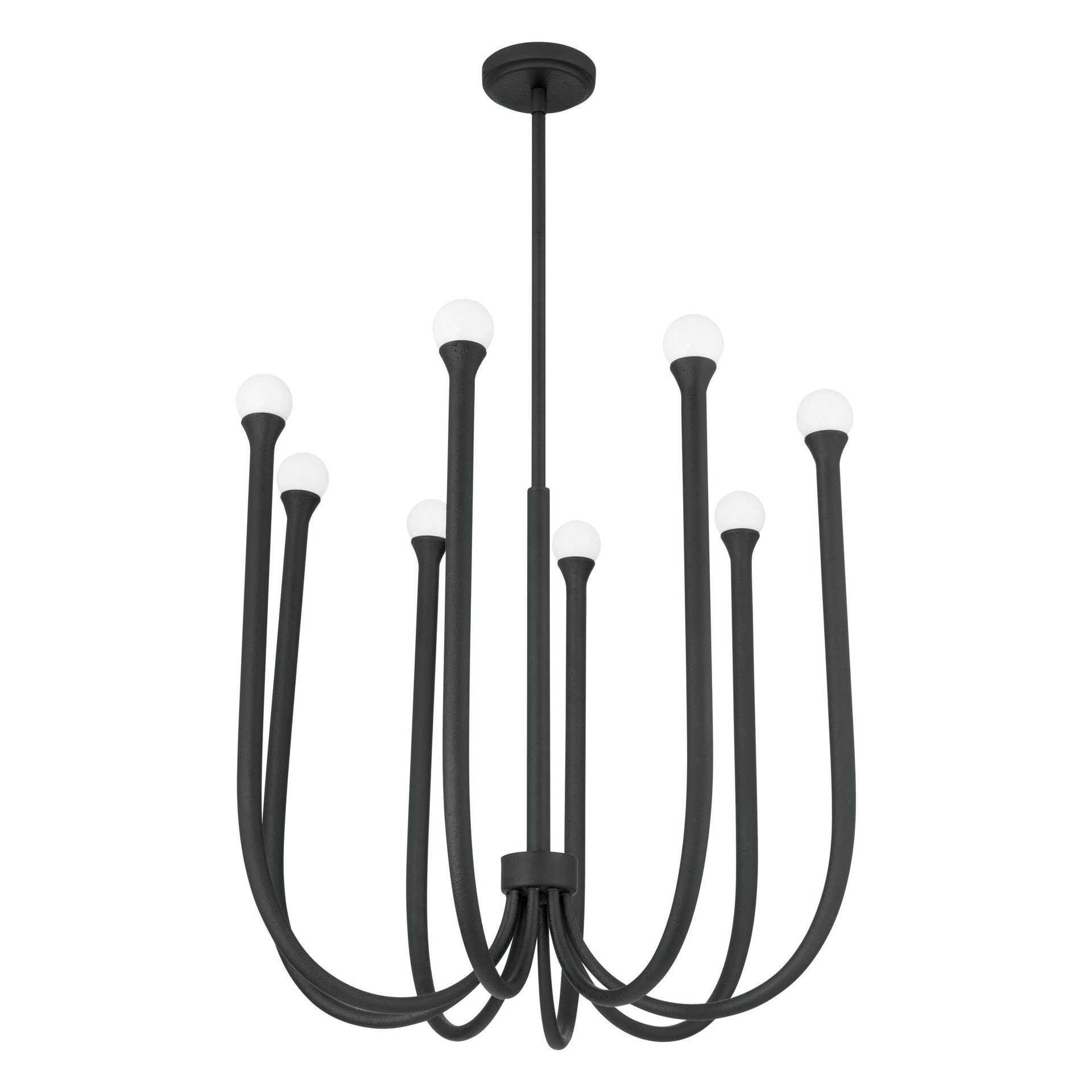 Le lustre Dahlia s'épanouit avec une grâce naturelle, ses courbes douces et ses bras décalés créant une impression de mouvement organique. Les bras élancés, dont l'épaisseur varie subtilement, s'étendent chacun pour accueillir une sphère en verre opale. Avec sa finition noir plâtre et ses huit lumières, cette composition incarne un luxe intemporel.