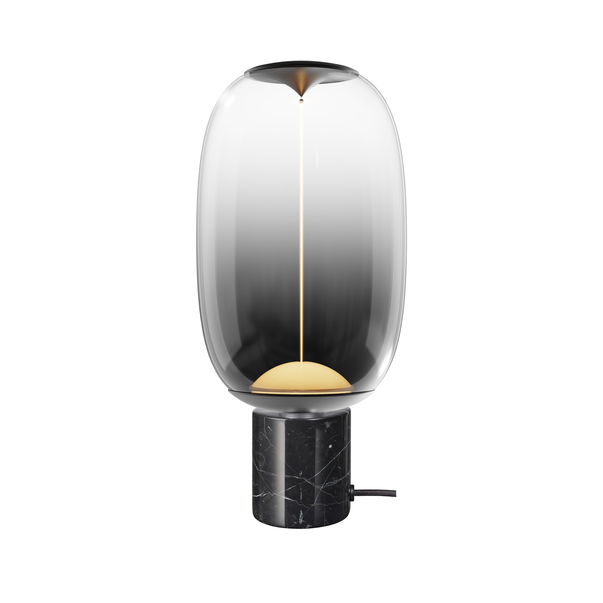 Élevez votre décor avec cette lampe au design unique alliant modernité et sophistication. Son ampoule en polycarbonate fumé crée une ambiance douce, chaleureuse et enveloppante, laissant apparaître une tige lumineuse raffinée qui diffuse la lumière de façon subtile et apaisante. La base en marbre noir ajoute une touche de luxe intemporel. Chaque pièce est naturellement unique grâce aux veinures distinctives du marbre, faisant de cette lampe un véritable objet décoratif autant qu’une source d’éclairage.