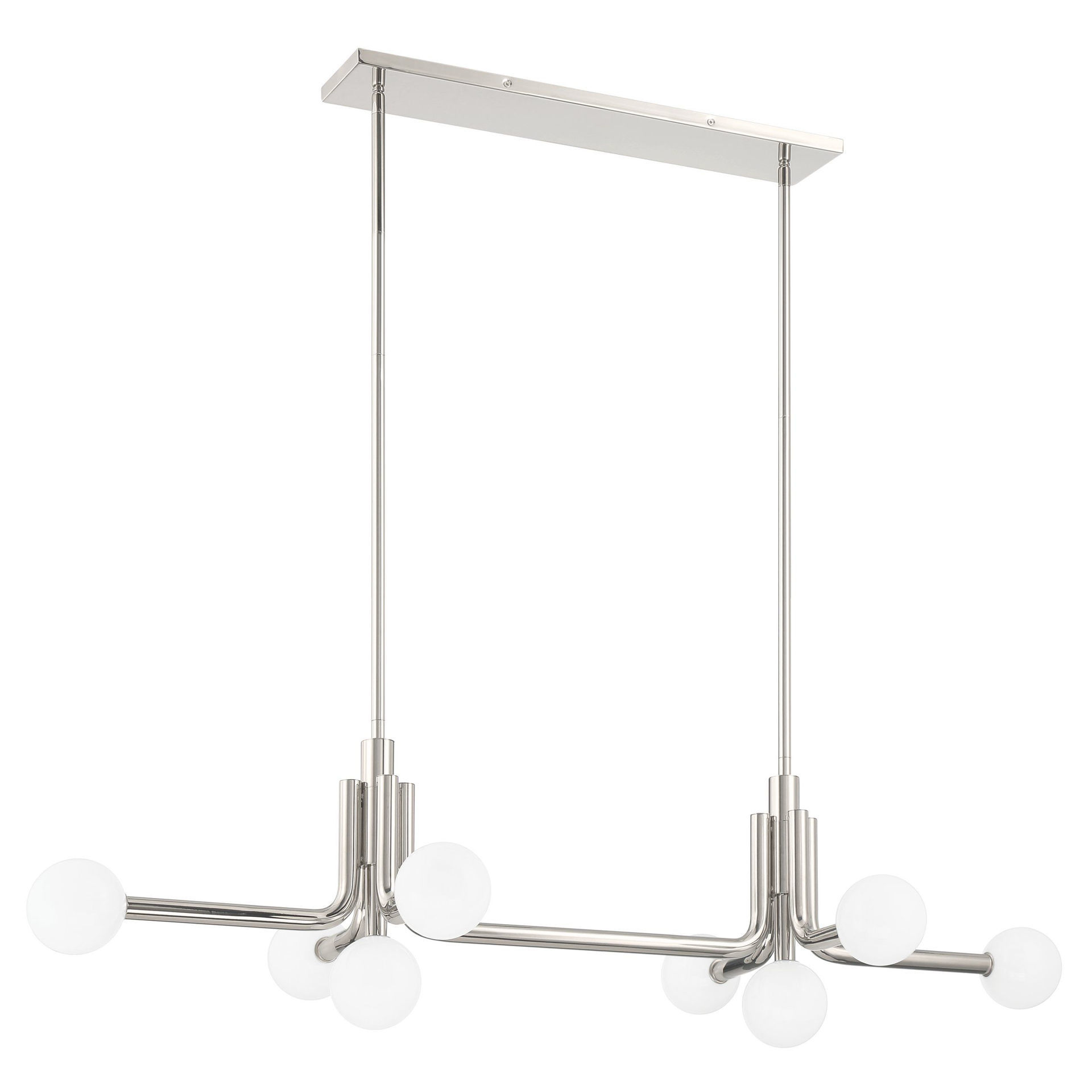 Le lustre linéaire Stockholm en nickel poli s'inspire du mobilier classique du milieu du XXe siècle, offrant une présence à la fois ludique et élégante. Sa structure tubulaire en métal aux lignes audacieuses est ornée de bras aux courbes douces, surmontés d'abat-jour en verre opale, réinterprétant avec modernité le style mid-century et une sophistication contemporaine. Avec son design raffiné et polyvalent à 8 lumières, Stockholm s'intègre harmonieusement à une grande variété d'intérieurs.