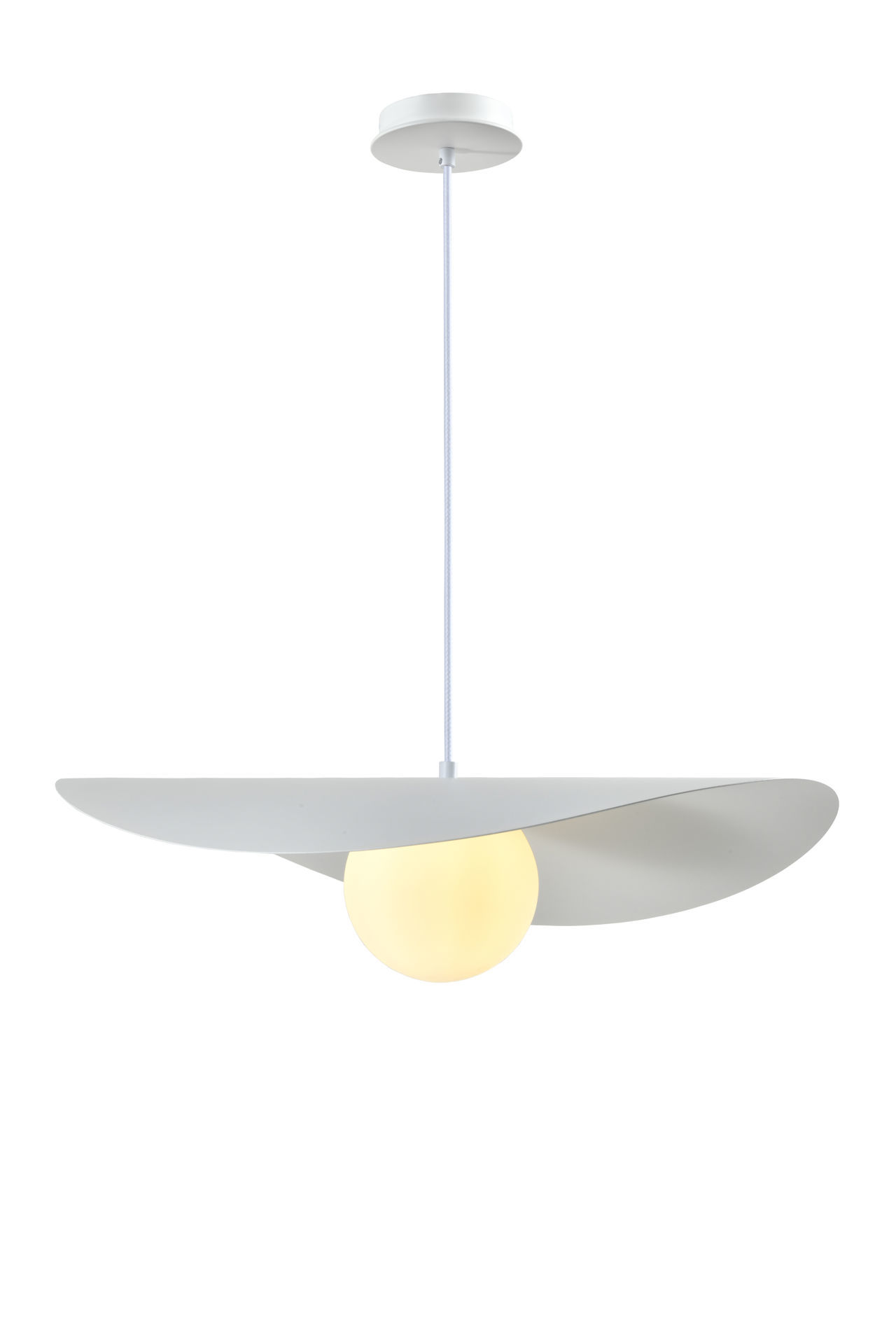 Son disque asymétrique crée un jeu d’ombre et de lumière tout en dissimulant délicatement la source lumineuse, alors que le globe assure un éclairage homogène et sans éblouissement. Épurée mais expressive, cette suspension s’intègre aussi bien aux décors modernes qu’aux intérieurs scandinaves ou contemporains. Parfaite au-dessus d’une table à manger, d’un îlot, dans une cage d’escalier ou en pièce maîtresse du salon.
